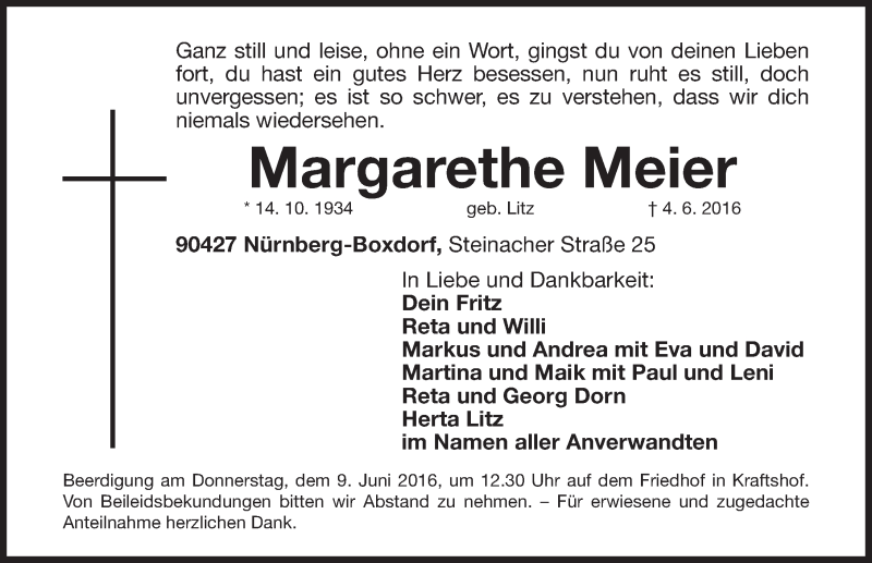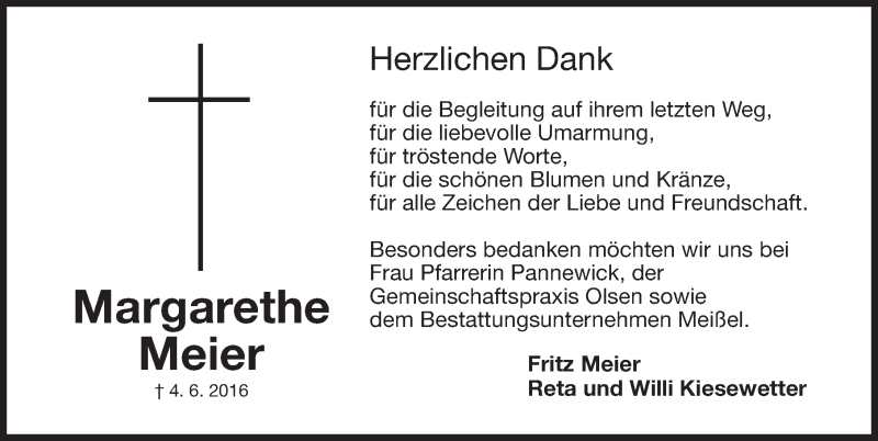 Hier finden Sie alle Traueranzeigen aus der Zeitung, die bisher für Margarethe Meier erschienen sind. Weitere Traueranzeigen, die in der Zeitung erscheinen, werden hier ebenfalls aufgelistet
