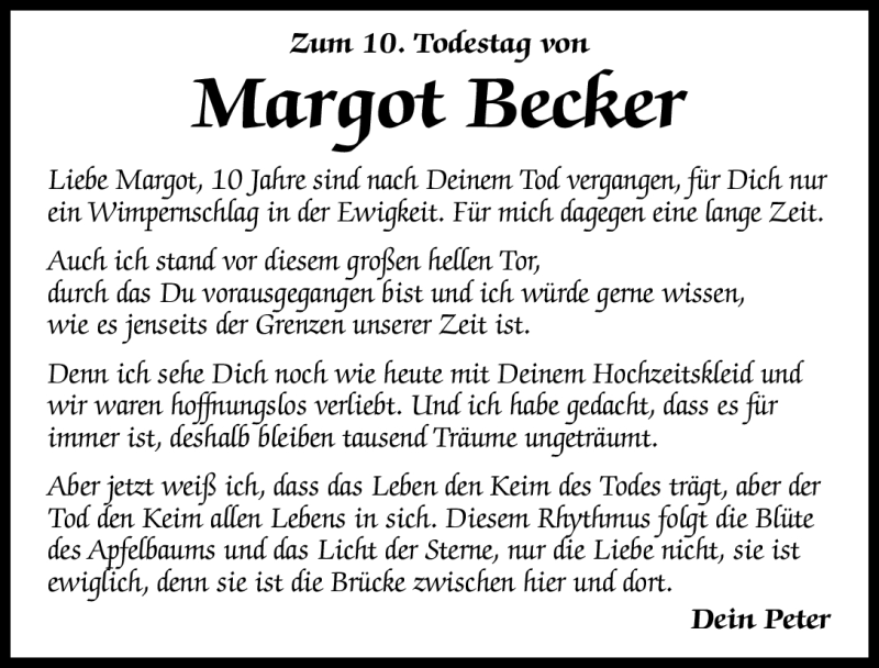 Hier finden Sie alle Traueranzeigen aus der Zeitung, die bisher für Margot Becker erschienen sind. Weitere Traueranzeigen, die in der Zeitung erscheinen, werden hier ebenfalls aufgelistet