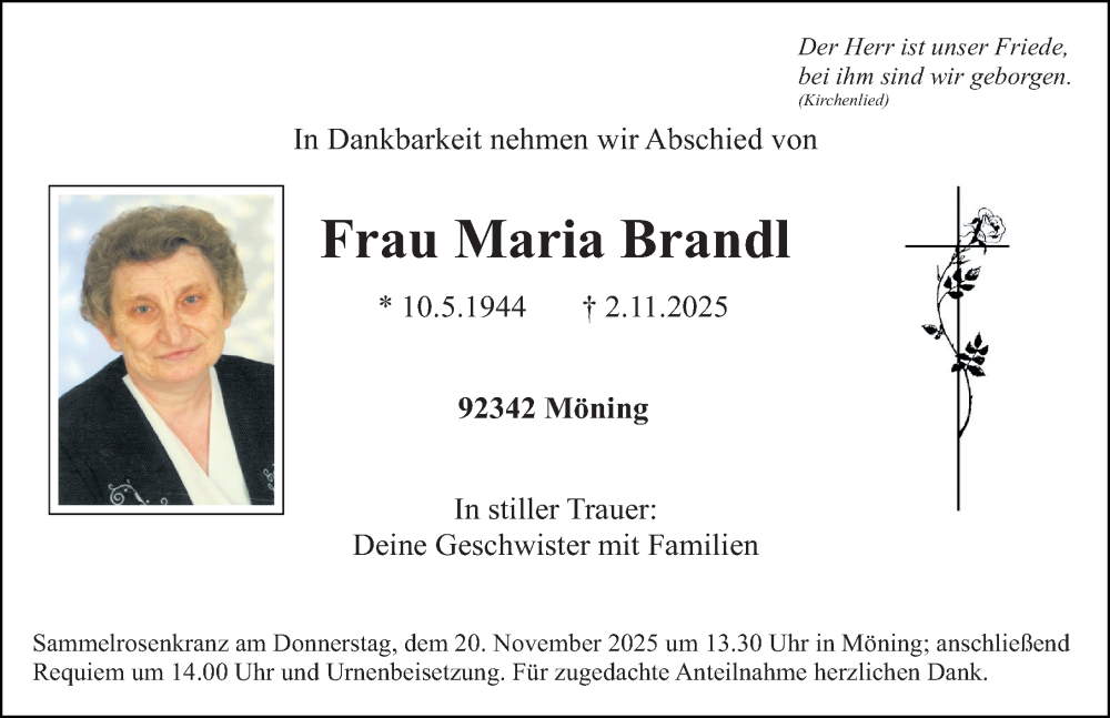 Hier finden Sie alle Traueranzeigen aus der Zeitung, die bisher für Maria Brandl erschienen sind. Weitere Traueranzeigen, die in der Zeitung erscheinen, werden hier ebenfalls aufgelistet