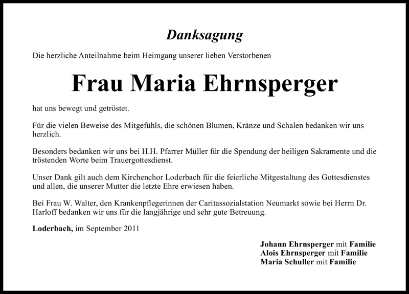 Hier finden Sie alle Traueranzeigen aus der Zeitung, die bisher für Maria Ehrnsperger erschienen sind. Weitere Traueranzeigen, die in der Zeitung erscheinen, werden hier ebenfalls aufgelistet
