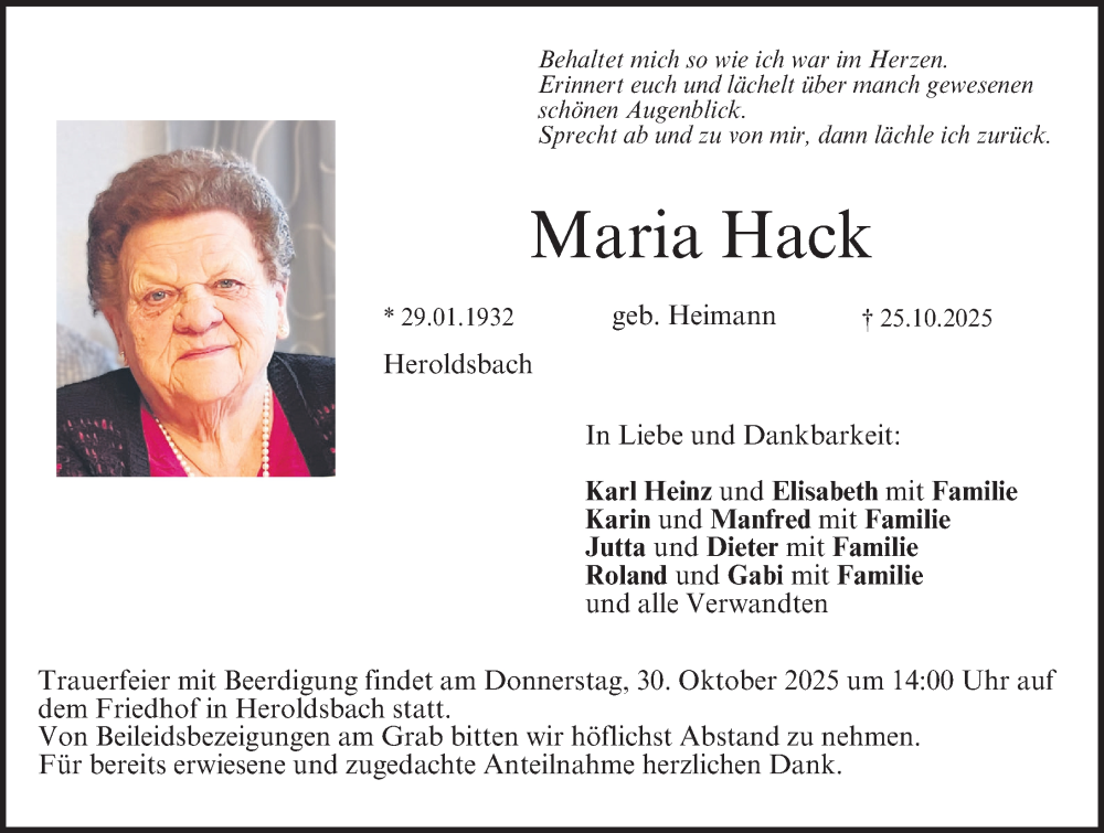 Hier finden Sie alle Traueranzeigen aus der Zeitung, die bisher für Maria Hack erschienen sind. Weitere Traueranzeigen, die in der Zeitung erscheinen, werden hier ebenfalls aufgelistet