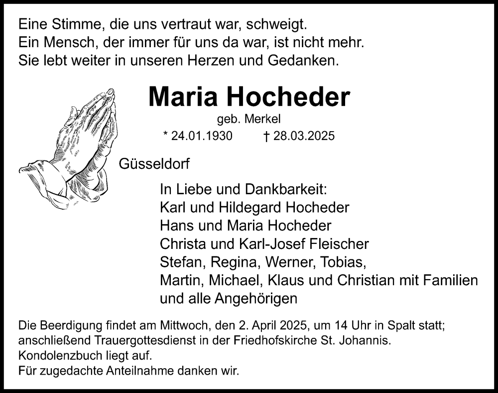 Hier finden Sie alle Traueranzeigen aus der Zeitung, die bisher für Maria Hocheder erschienen sind. Weitere Traueranzeigen, die in der Zeitung erscheinen, werden hier ebenfalls aufgelistet