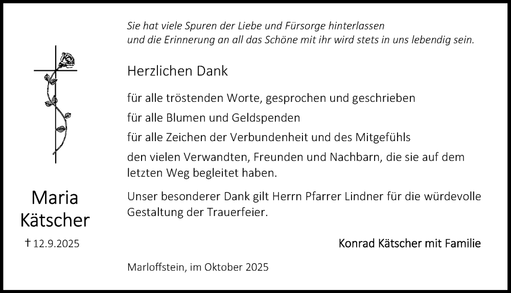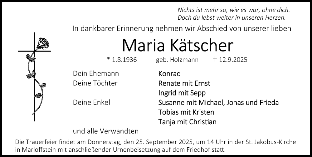 Hier finden Sie alle Traueranzeigen aus der Zeitung, die bisher für Maria Kätscher erschienen sind. Weitere Traueranzeigen, die in der Zeitung erscheinen, werden hier ebenfalls aufgelistet