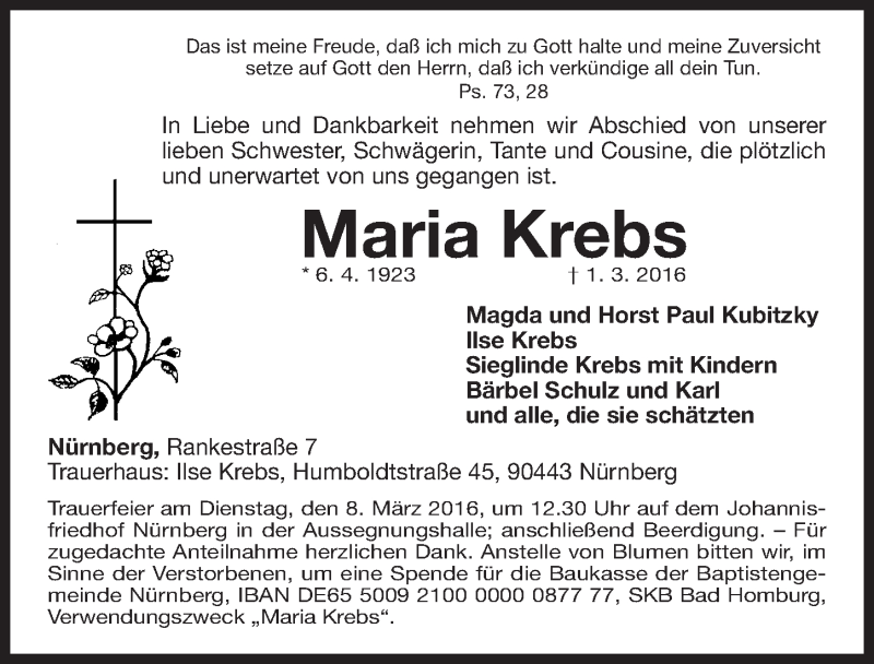 Hier finden Sie alle Traueranzeigen aus der Zeitung, die bisher für Maria Krebs erschienen sind. Weitere Traueranzeigen, die in der Zeitung erscheinen, werden hier ebenfalls aufgelistet
