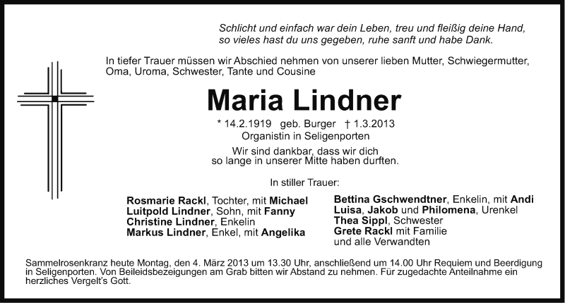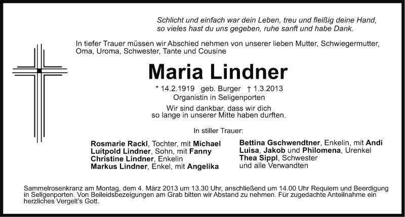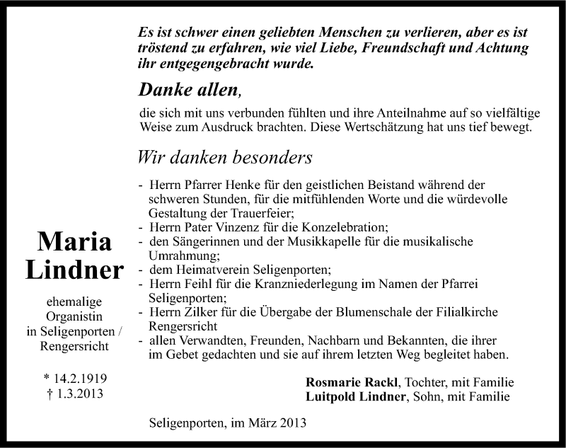 Hier finden Sie alle Traueranzeigen aus der Zeitung, die bisher für Maria Lindner erschienen sind. Weitere Traueranzeigen, die in der Zeitung erscheinen, werden hier ebenfalls aufgelistet