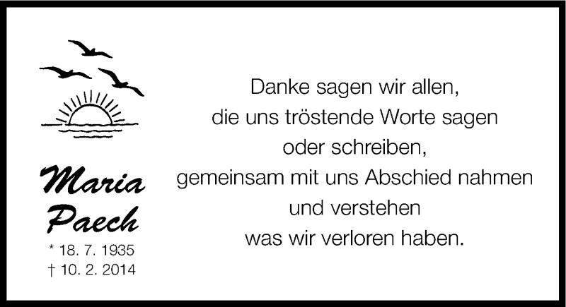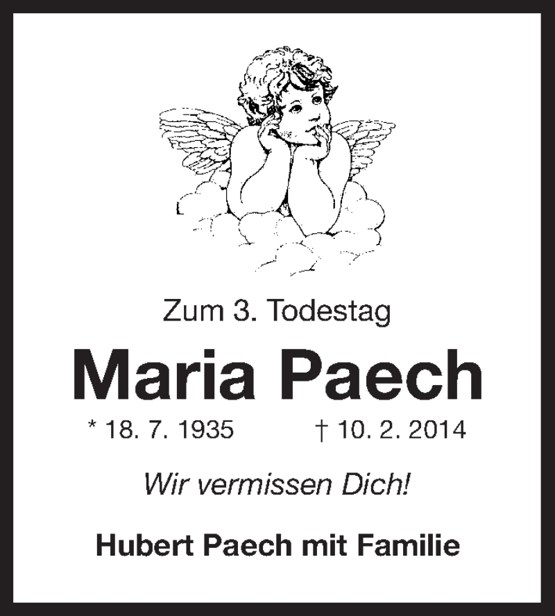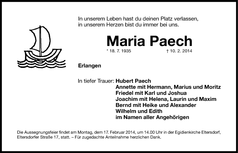 Hier finden Sie alle Traueranzeigen aus der Zeitung, die bisher für Maria Paech erschienen sind. Weitere Traueranzeigen, die in der Zeitung erscheinen, werden hier ebenfalls aufgelistet