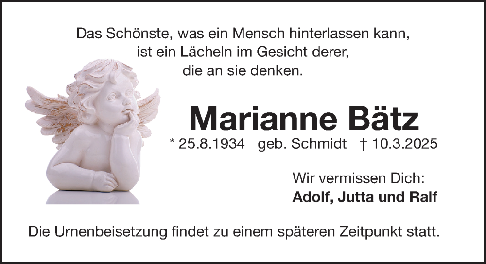 Hier finden Sie alle Traueranzeigen aus der Zeitung, die bisher für Marianne Bätz erschienen sind. Weitere Traueranzeigen, die in der Zeitung erscheinen, werden hier ebenfalls aufgelistet