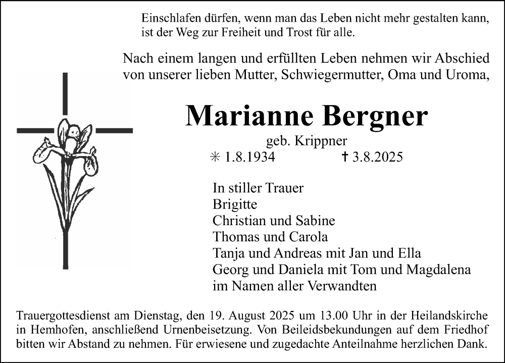 Hier finden Sie alle Traueranzeigen aus der Zeitung, die bisher für Marianne Bergner erschienen sind. Weitere Traueranzeigen, die in der Zeitung erscheinen, werden hier ebenfalls aufgelistet