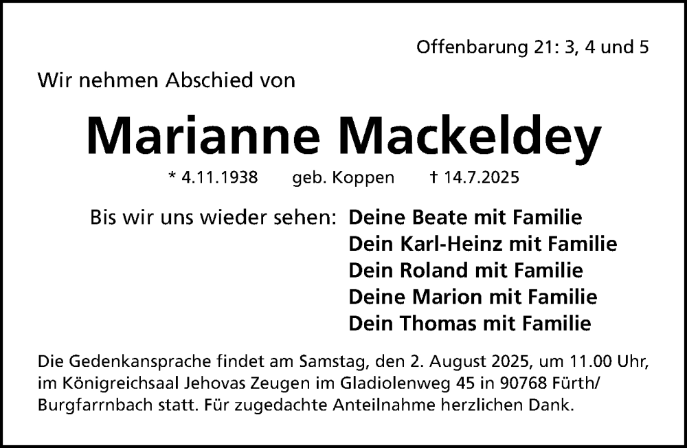 Hier finden Sie alle Traueranzeigen aus der Zeitung, die bisher für Marianne Mackeldey erschienen sind. Weitere Traueranzeigen, die in der Zeitung erscheinen, werden hier ebenfalls aufgelistet