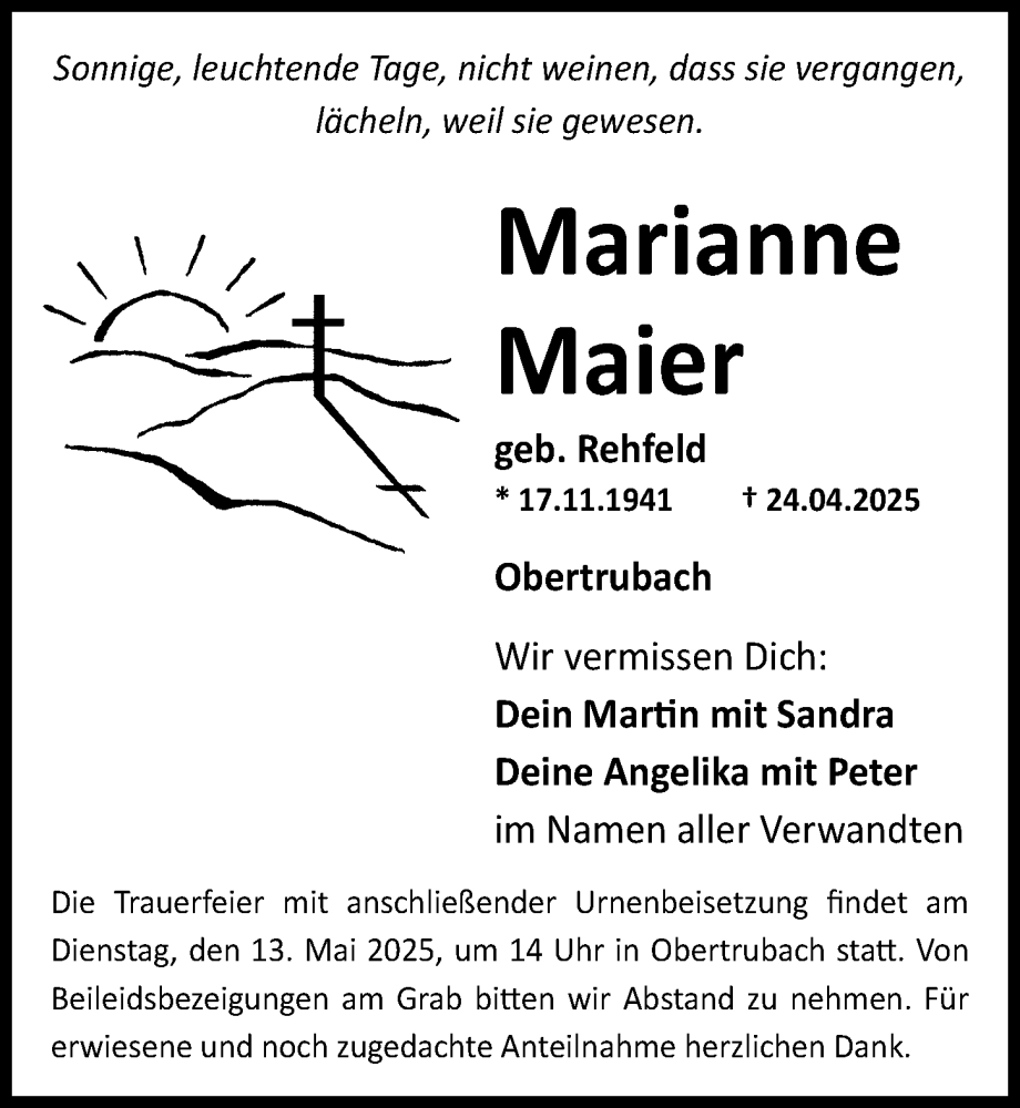 Hier finden Sie alle Traueranzeigen aus der Zeitung, die bisher für Marianne Maier erschienen sind. Weitere Traueranzeigen, die in der Zeitung erscheinen, werden hier ebenfalls aufgelistet