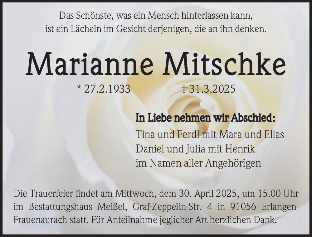 Hier finden Sie alle Traueranzeigen aus der Zeitung, die bisher für Marianne Mitschke erschienen sind. Weitere Traueranzeigen, die in der Zeitung erscheinen, werden hier ebenfalls aufgelistet