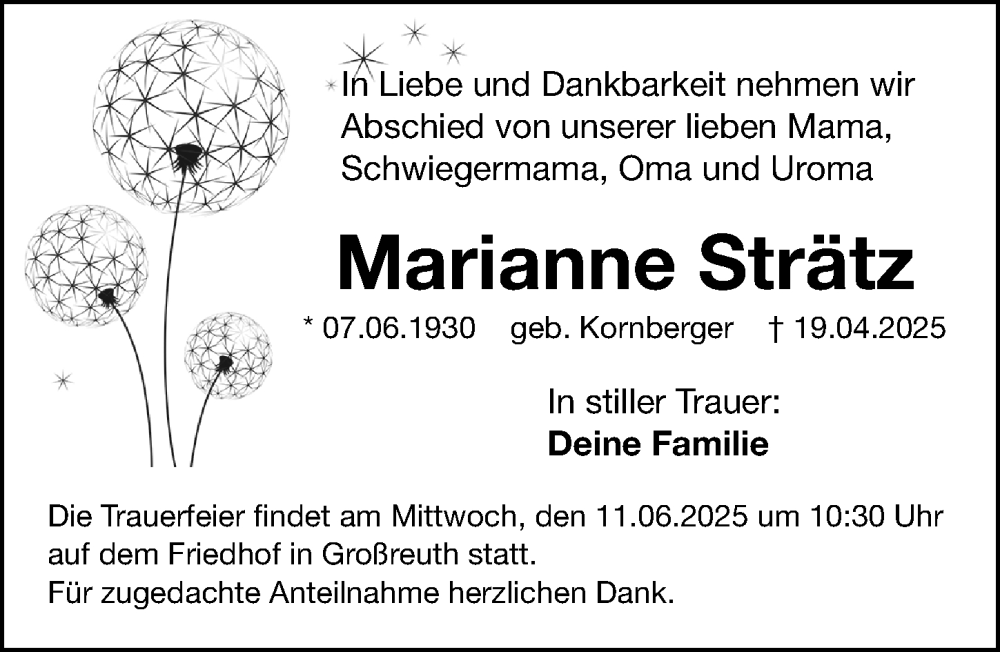 Hier finden Sie alle Traueranzeigen aus der Zeitung, die bisher für Marianne Strätz erschienen sind. Weitere Traueranzeigen, die in der Zeitung erscheinen, werden hier ebenfalls aufgelistet