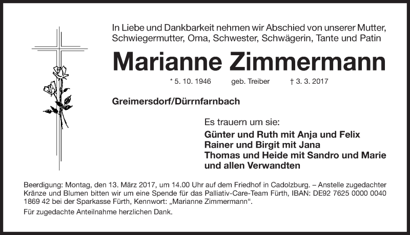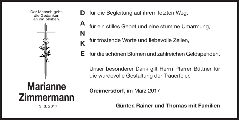 Hier finden Sie alle Traueranzeigen aus der Zeitung, die bisher für Marianne Zimmermann erschienen sind. Weitere Traueranzeigen, die in der Zeitung erscheinen, werden hier ebenfalls aufgelistet