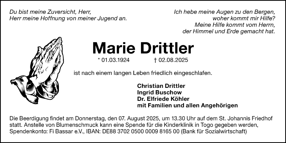 Hier finden Sie alle Traueranzeigen aus der Zeitung, die bisher für Marie Drittler erschienen sind. Weitere Traueranzeigen, die in der Zeitung erscheinen, werden hier ebenfalls aufgelistet