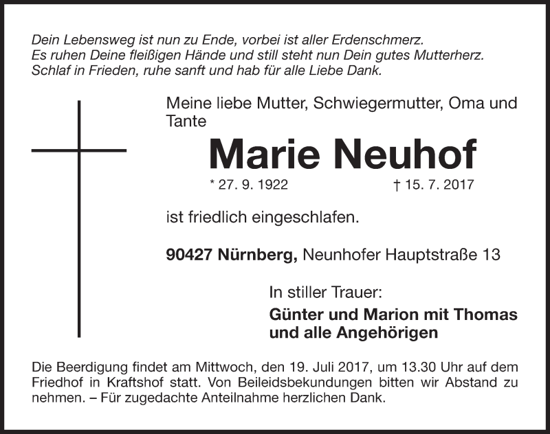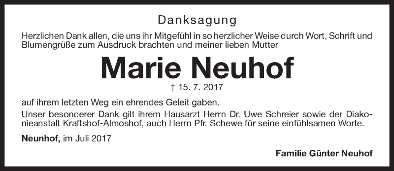 Hier finden Sie alle Traueranzeigen aus der Zeitung, die bisher für Marie Neuhof erschienen sind. Weitere Traueranzeigen, die in der Zeitung erscheinen, werden hier ebenfalls aufgelistet