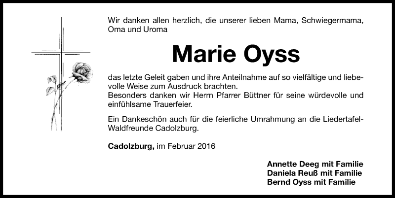 Hier finden Sie alle Traueranzeigen aus der Zeitung, die bisher für Marie Oyss erschienen sind. Weitere Traueranzeigen, die in der Zeitung erscheinen, werden hier ebenfalls aufgelistet