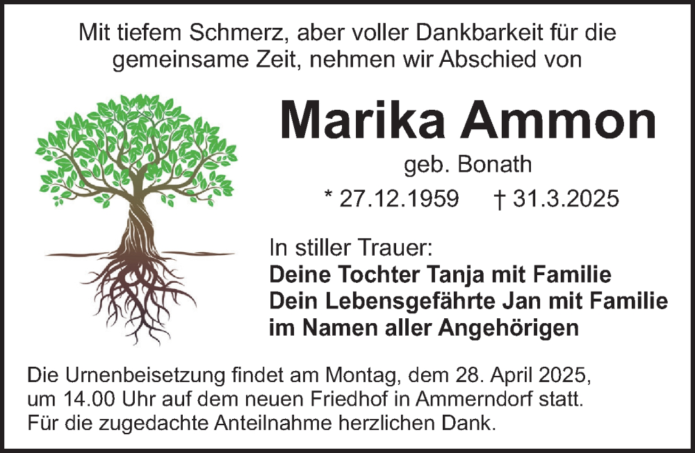 Hier finden Sie alle Traueranzeigen aus der Zeitung, die bisher für Marika Ammon erschienen sind. Weitere Traueranzeigen, die in der Zeitung erscheinen, werden hier ebenfalls aufgelistet