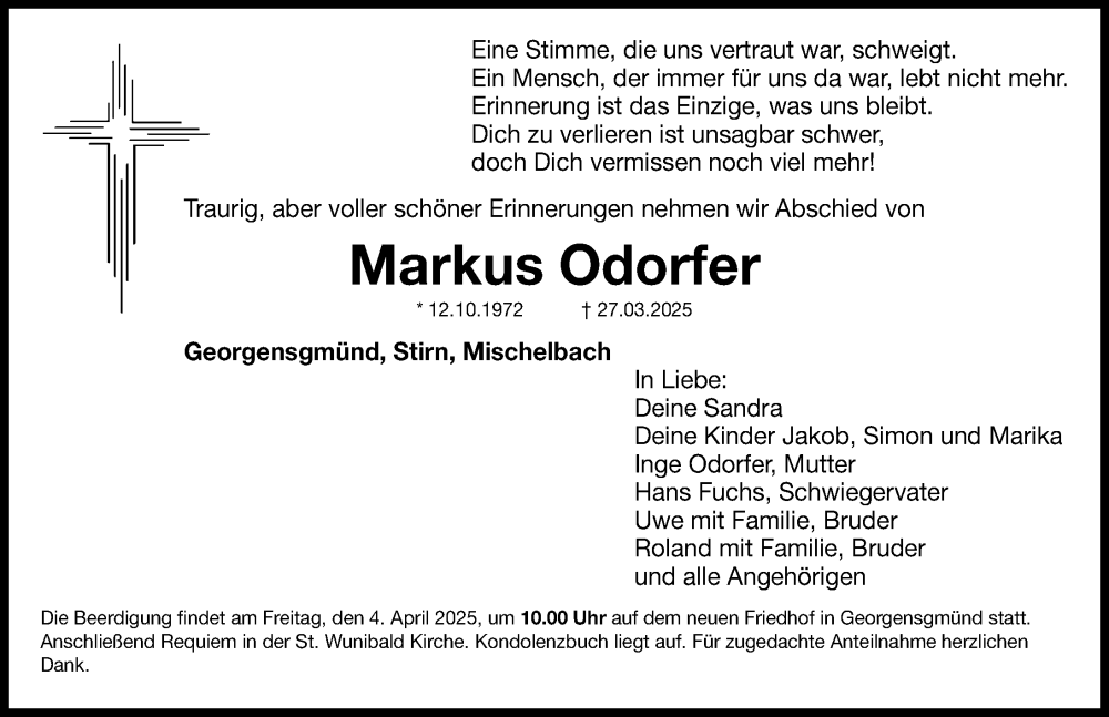 Hier finden Sie alle Traueranzeigen aus der Zeitung, die bisher für Markus Odorfer erschienen sind. Weitere Traueranzeigen, die in der Zeitung erscheinen, werden hier ebenfalls aufgelistet