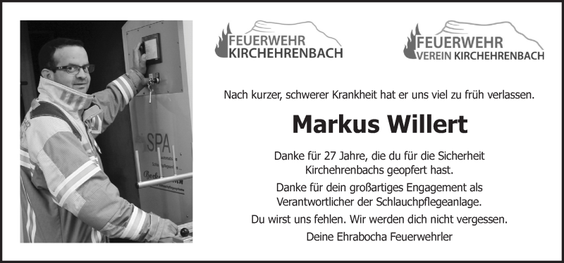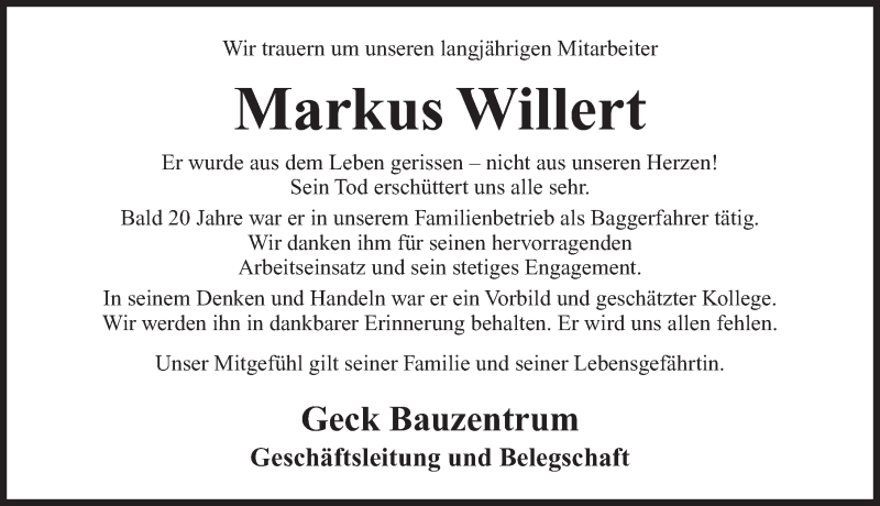 Hier finden Sie alle Traueranzeigen aus der Zeitung, die bisher für Markus Willert erschienen sind. Weitere Traueranzeigen, die in der Zeitung erscheinen, werden hier ebenfalls aufgelistet