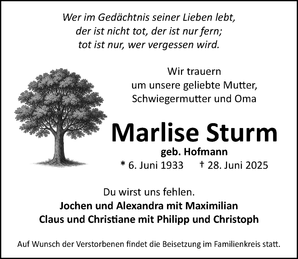 Hier finden Sie alle Traueranzeigen aus der Zeitung, die bisher für Marlise Sturm erschienen sind. Weitere Traueranzeigen, die in der Zeitung erscheinen, werden hier ebenfalls aufgelistet