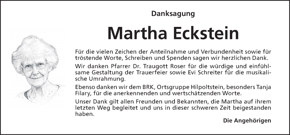 Hier finden Sie alle Traueranzeigen aus der Zeitung, die bisher für Martha Eckstein erschienen sind. Weitere Traueranzeigen, die in der Zeitung erscheinen, werden hier ebenfalls aufgelistet