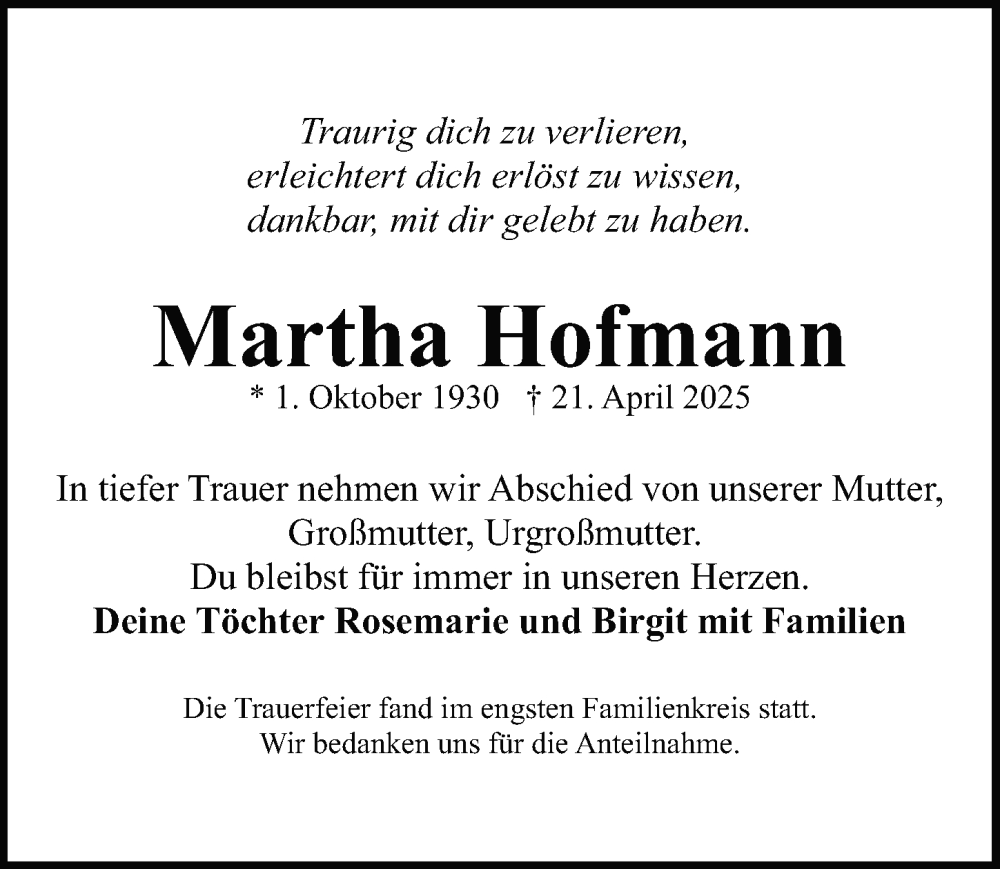 Hier finden Sie alle Traueranzeigen aus der Zeitung, die bisher für Martha Hofmann erschienen sind. Weitere Traueranzeigen, die in der Zeitung erscheinen, werden hier ebenfalls aufgelistet