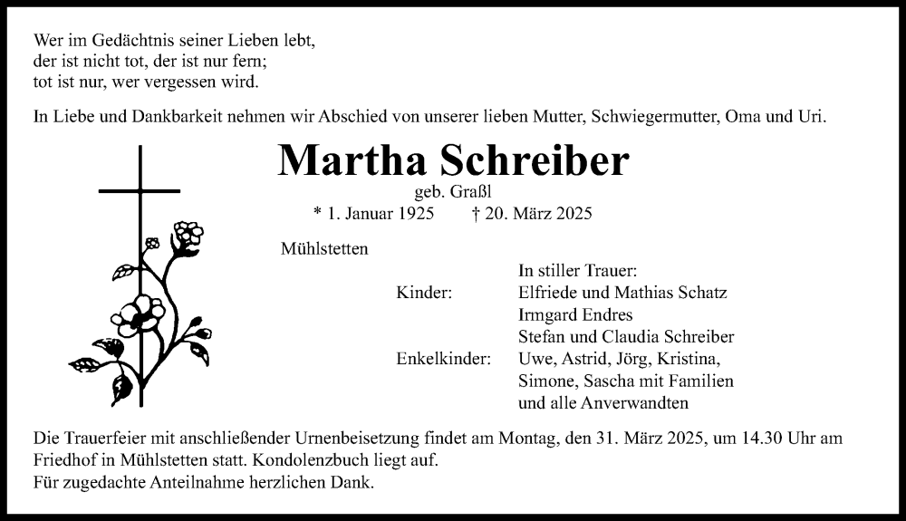 Hier finden Sie alle Traueranzeigen aus der Zeitung, die bisher für Martha Schreiber erschienen sind. Weitere Traueranzeigen, die in der Zeitung erscheinen, werden hier ebenfalls aufgelistet