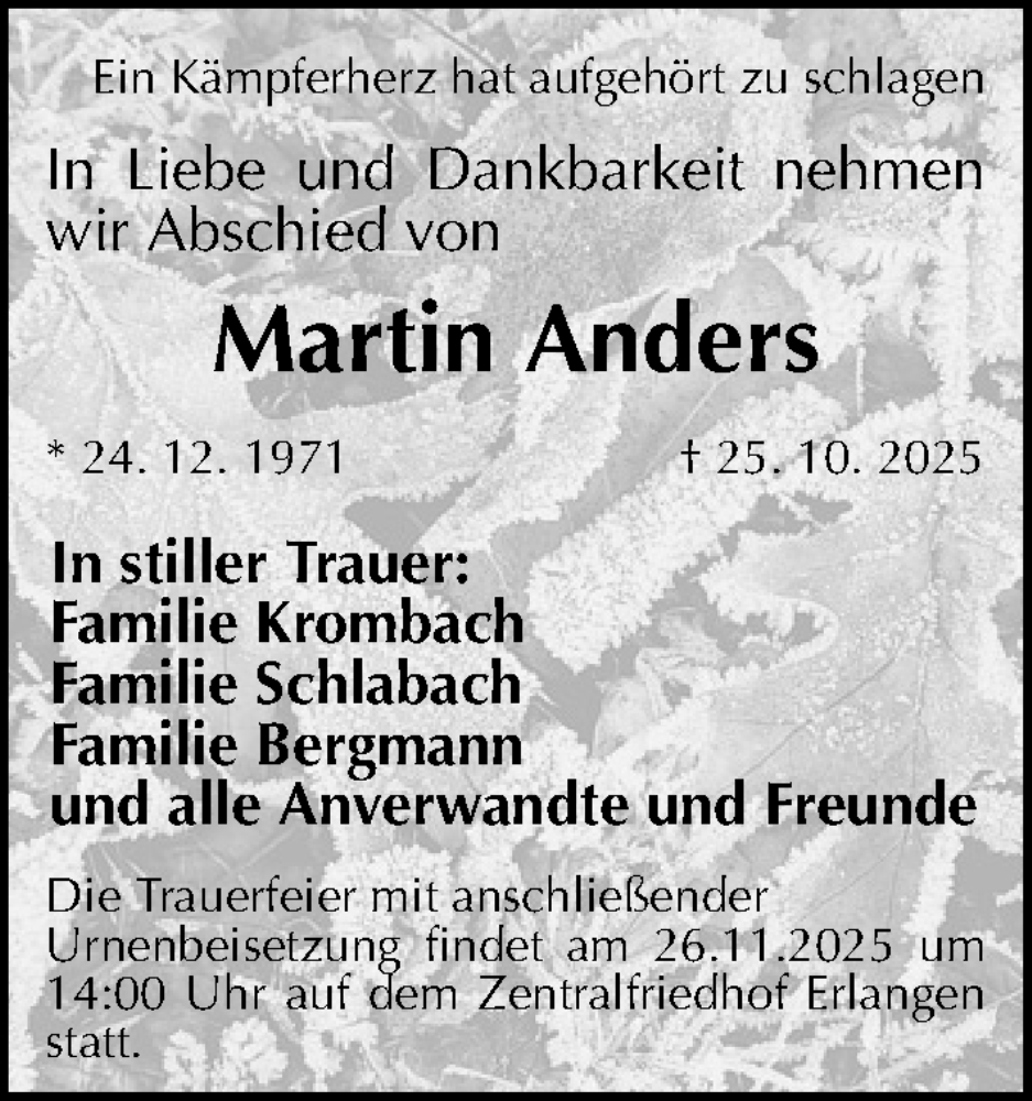 Hier finden Sie alle Traueranzeigen aus der Zeitung, die bisher für Martin Anders erschienen sind. Weitere Traueranzeigen, die in der Zeitung erscheinen, werden hier ebenfalls aufgelistet