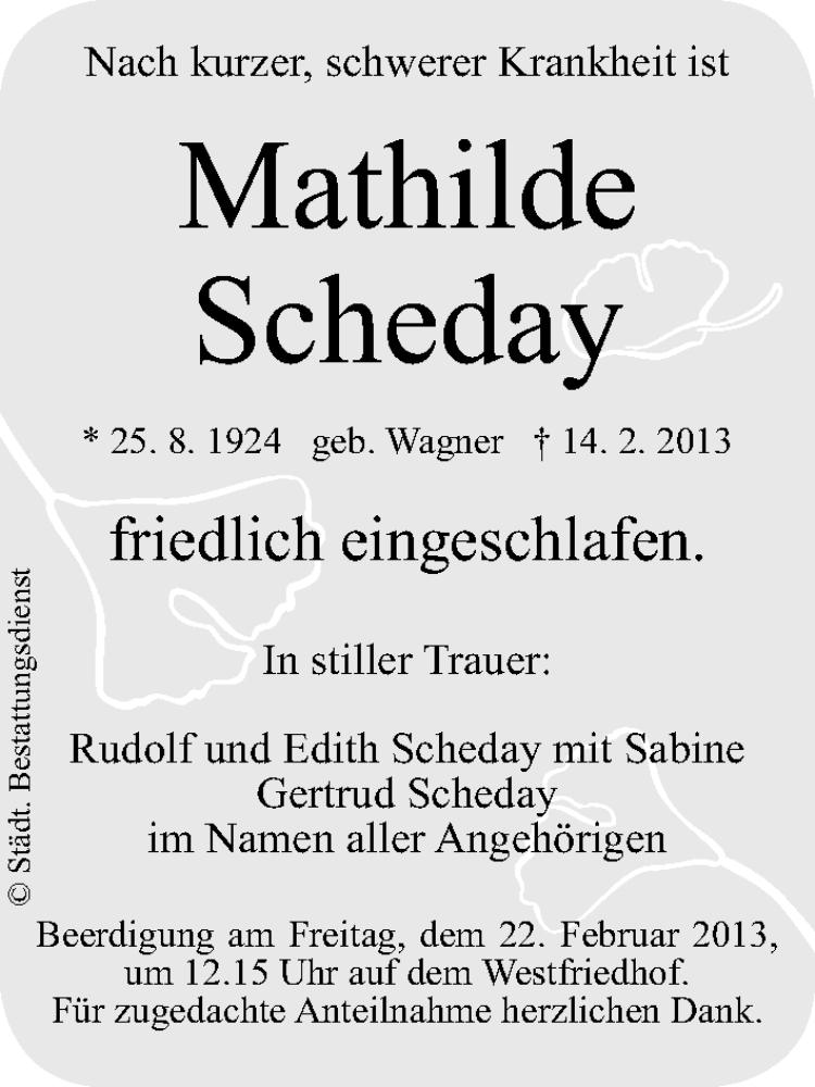 Hier finden Sie alle Traueranzeigen aus der Zeitung, die bisher für Mathilde Scheday erschienen sind. Weitere Traueranzeigen, die in der Zeitung erscheinen, werden hier ebenfalls aufgelistet