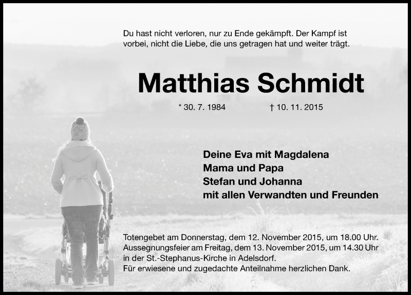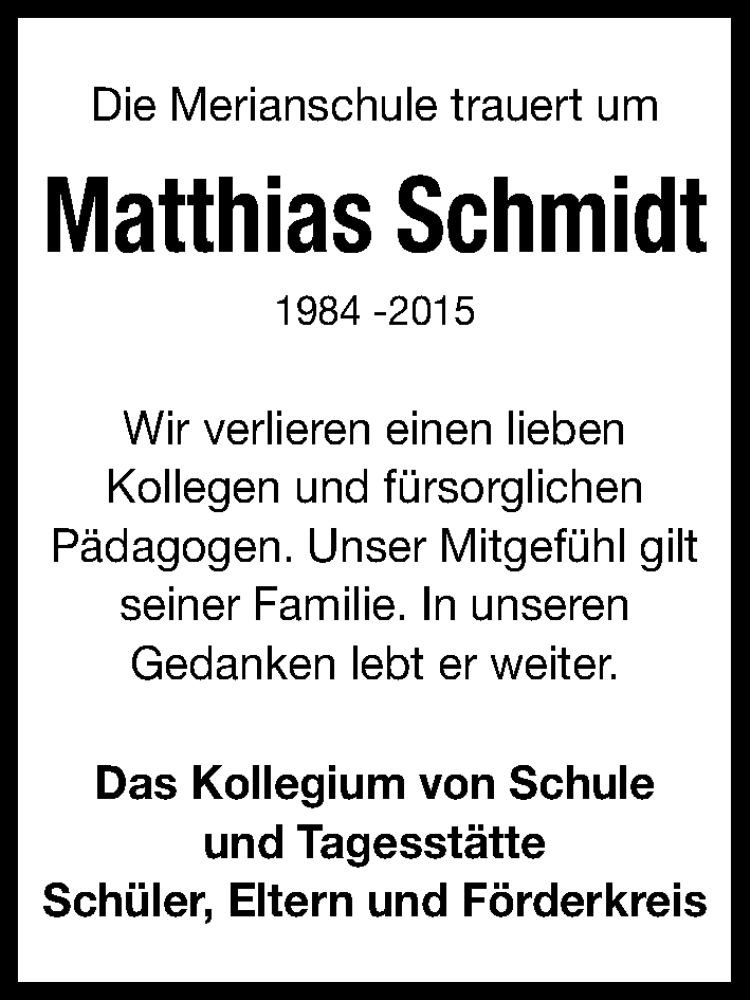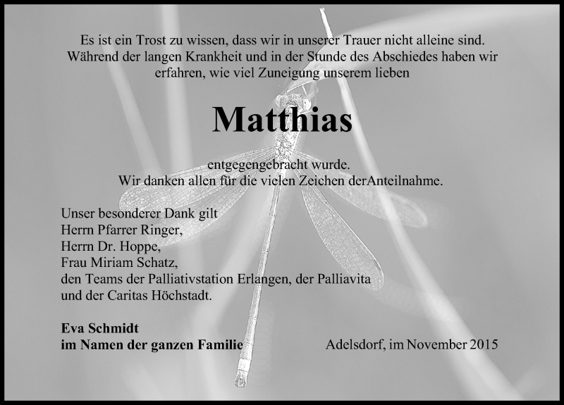 Hier finden Sie alle Traueranzeigen aus der Zeitung, die bisher für Matthias Schmidt erschienen sind. Weitere Traueranzeigen, die in der Zeitung erscheinen, werden hier ebenfalls aufgelistet