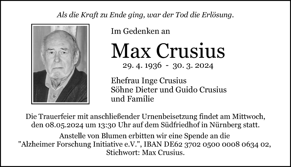 Hier finden Sie alle Traueranzeigen aus der Zeitung, die bisher für Max Crusius erschienen sind. Weitere Traueranzeigen, die in der Zeitung erscheinen, werden hier ebenfalls aufgelistet