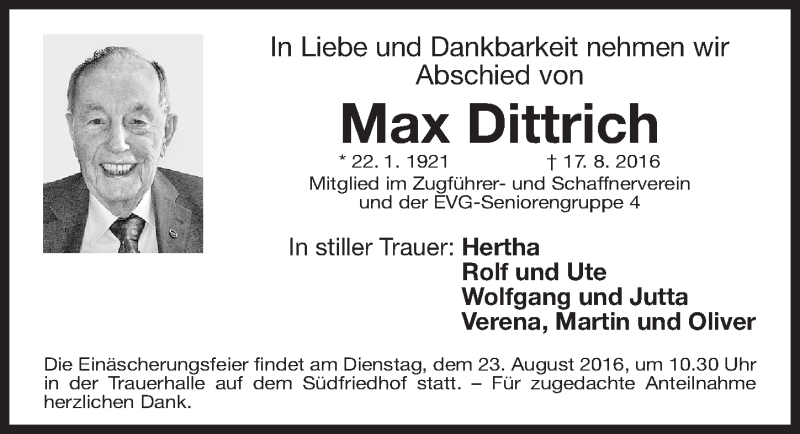Hier finden Sie alle Traueranzeigen aus der Zeitung, die bisher für Max Dittrich erschienen sind. Weitere Traueranzeigen, die in der Zeitung erscheinen, werden hier ebenfalls aufgelistet