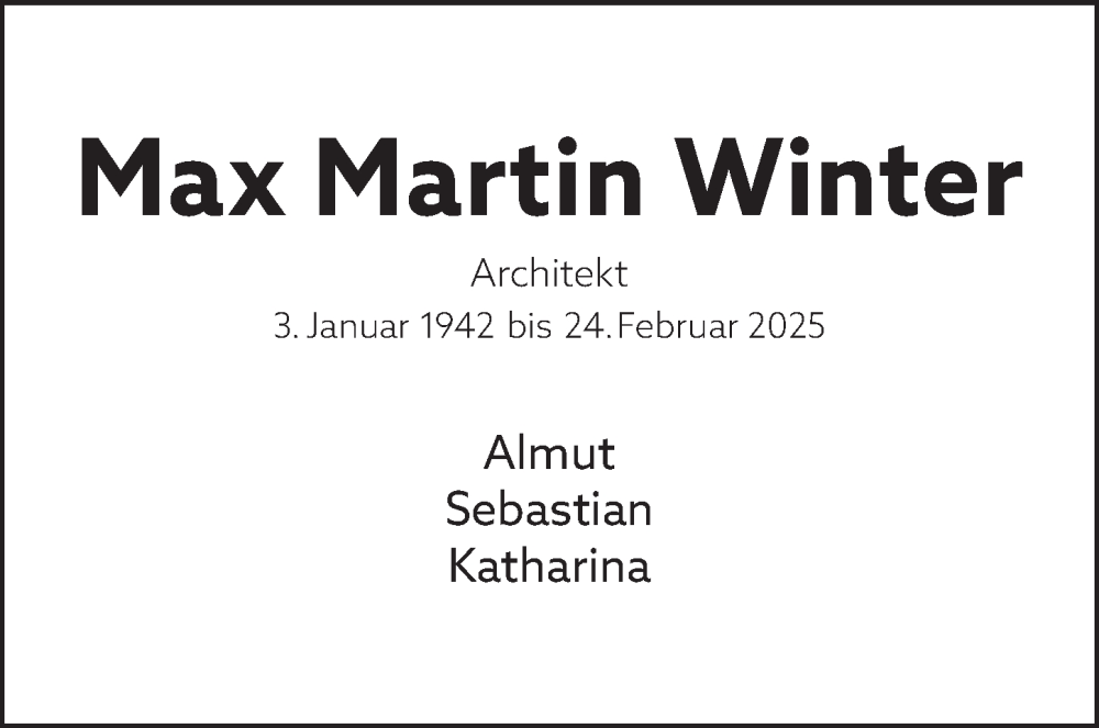Hier finden Sie alle Traueranzeigen aus der Zeitung, die bisher für Max Martin Winter erschienen sind. Weitere Traueranzeigen, die in der Zeitung erscheinen, werden hier ebenfalls aufgelistet