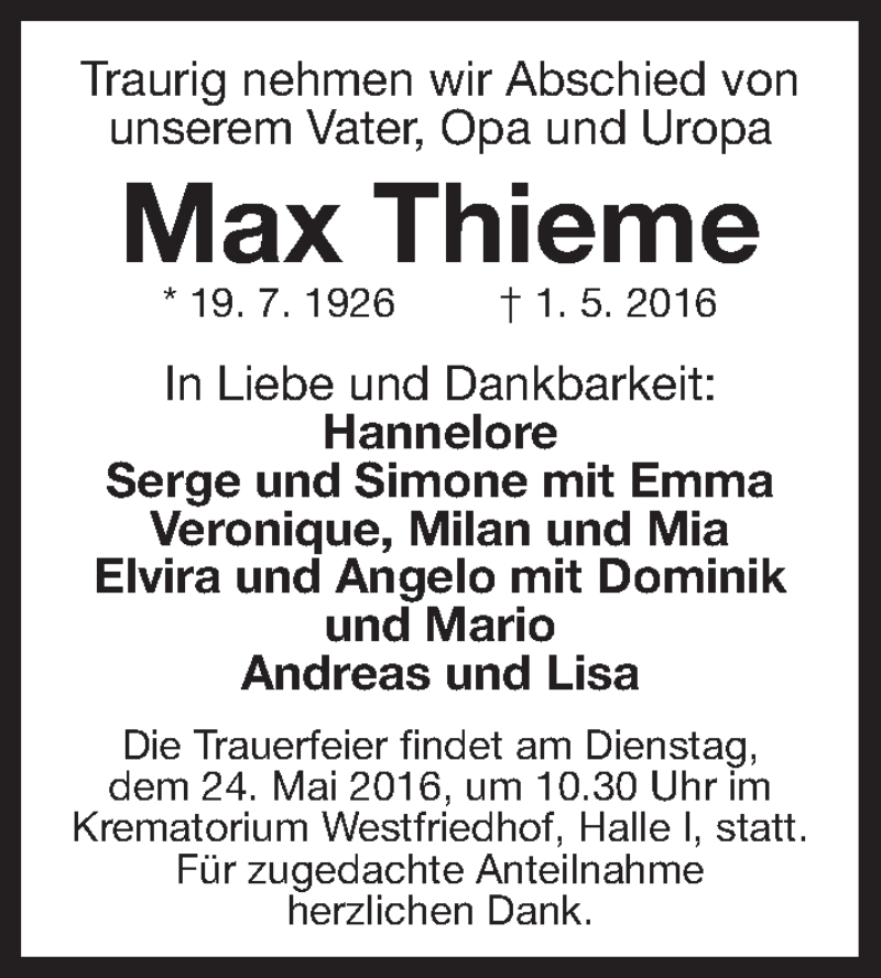 Hier finden Sie alle Traueranzeigen aus der Zeitung, die bisher für Max Thieme erschienen sind. Weitere Traueranzeigen, die in der Zeitung erscheinen, werden hier ebenfalls aufgelistet