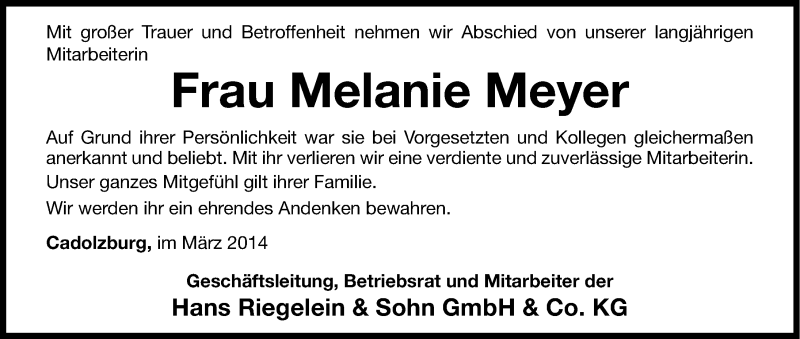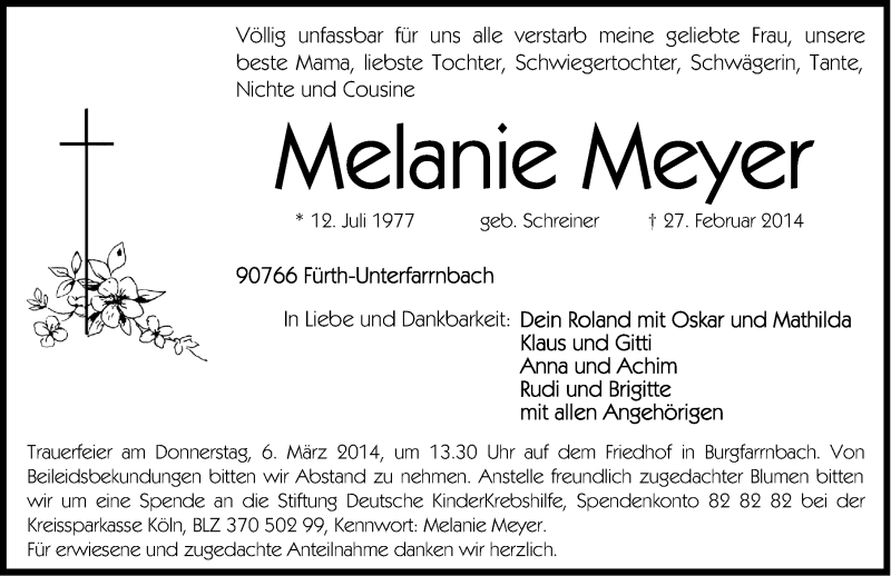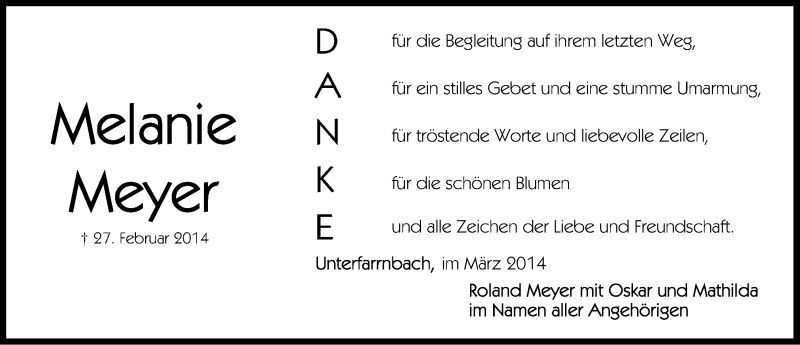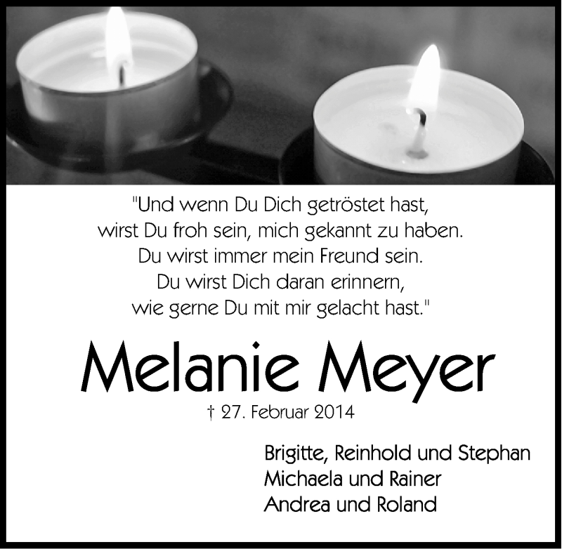 Hier finden Sie alle Traueranzeigen aus der Zeitung, die bisher für Melanie Meyer erschienen sind. Weitere Traueranzeigen, die in der Zeitung erscheinen, werden hier ebenfalls aufgelistet