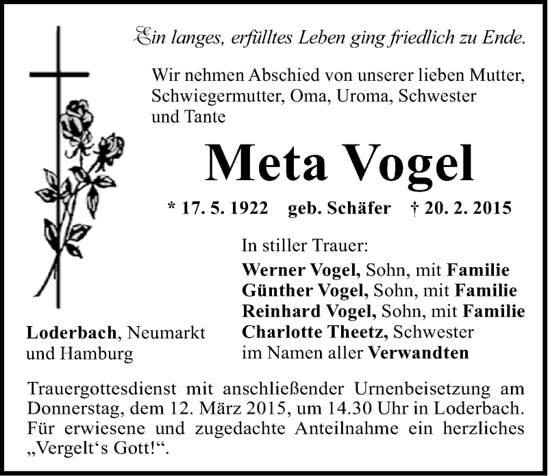 Hier finden Sie alle Traueranzeigen aus der Zeitung, die bisher für Meta Vogel erschienen sind. Weitere Traueranzeigen, die in der Zeitung erscheinen, werden hier ebenfalls aufgelistet