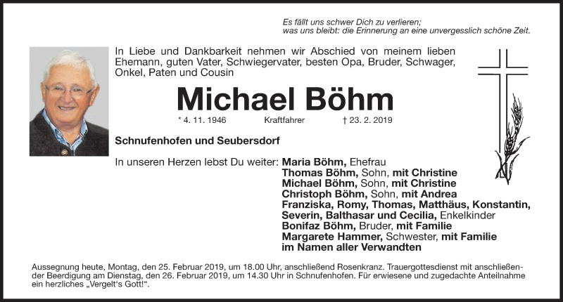 Hier finden Sie alle Traueranzeigen aus der Zeitung, die bisher für Michael Böhm erschienen sind. Weitere Traueranzeigen, die in der Zeitung erscheinen, werden hier ebenfalls aufgelistet