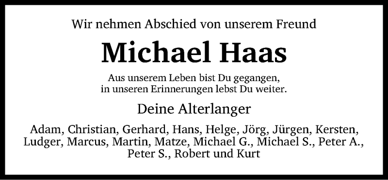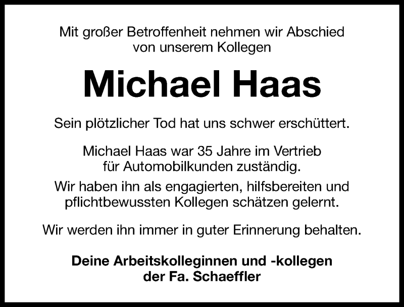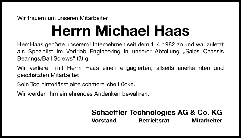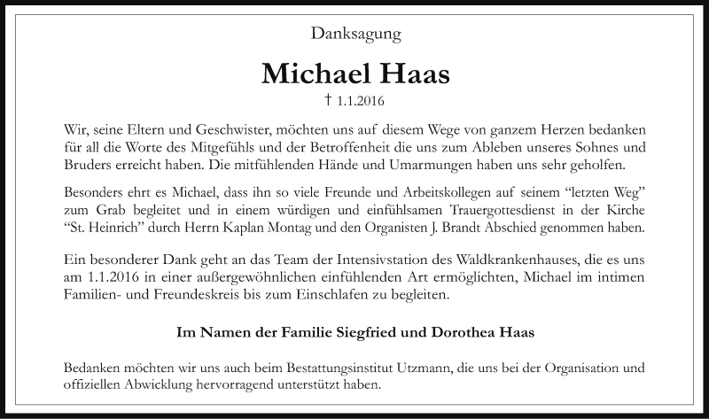 Hier finden Sie alle Traueranzeigen aus der Zeitung, die bisher für Michael Haas erschienen sind. Weitere Traueranzeigen, die in der Zeitung erscheinen, werden hier ebenfalls aufgelistet