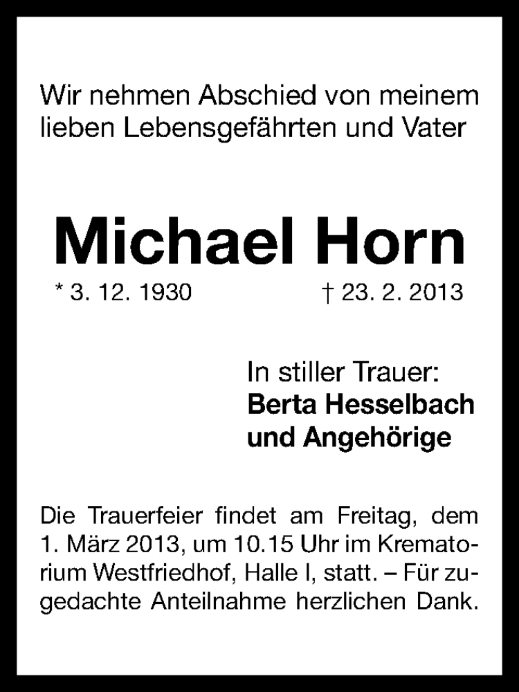 Hier finden Sie alle Traueranzeigen aus der Zeitung, die bisher für Michael Horn erschienen sind. Weitere Traueranzeigen, die in der Zeitung erscheinen, werden hier ebenfalls aufgelistet