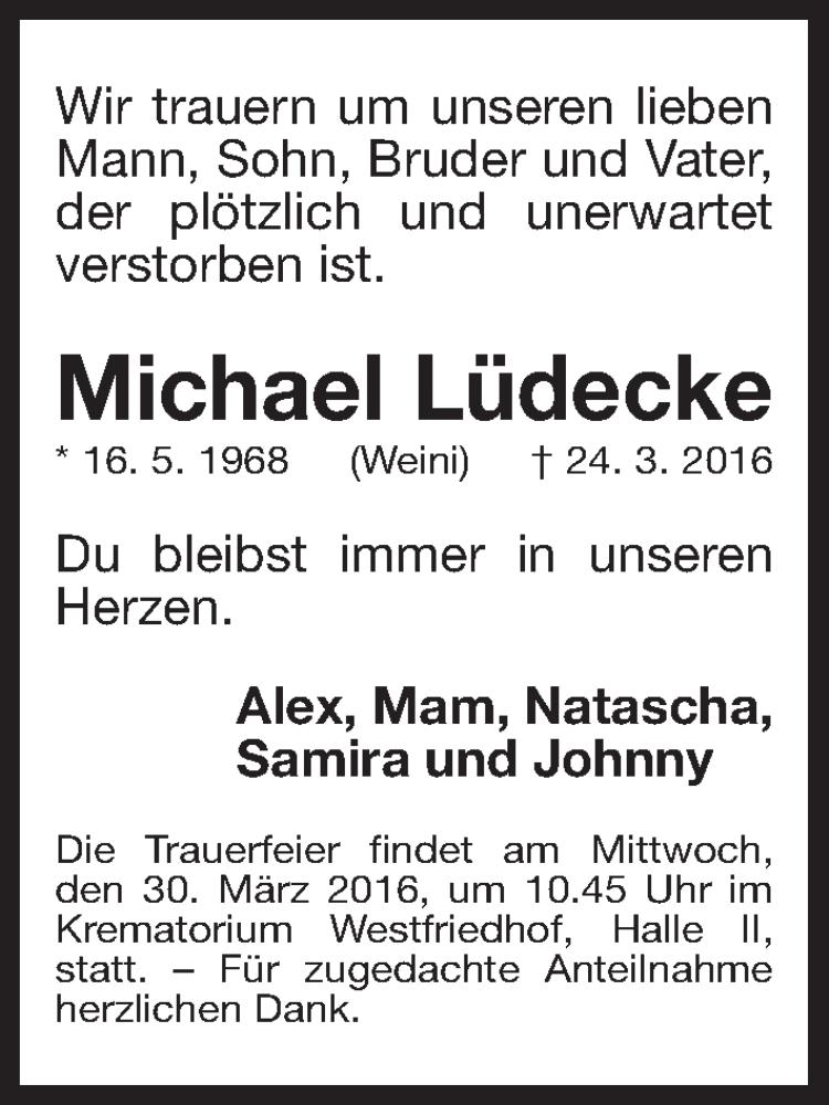 Hier finden Sie alle Traueranzeigen aus der Zeitung, die bisher für Michael Lüdecke erschienen sind. Weitere Traueranzeigen, die in der Zeitung erscheinen, werden hier ebenfalls aufgelistet