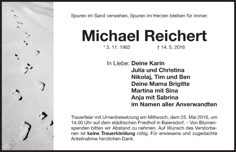 Hier finden Sie alle Traueranzeigen aus der Zeitung, die bisher für Michael Reichert erschienen sind. Weitere Traueranzeigen, die in der Zeitung erscheinen, werden hier ebenfalls aufgelistet
