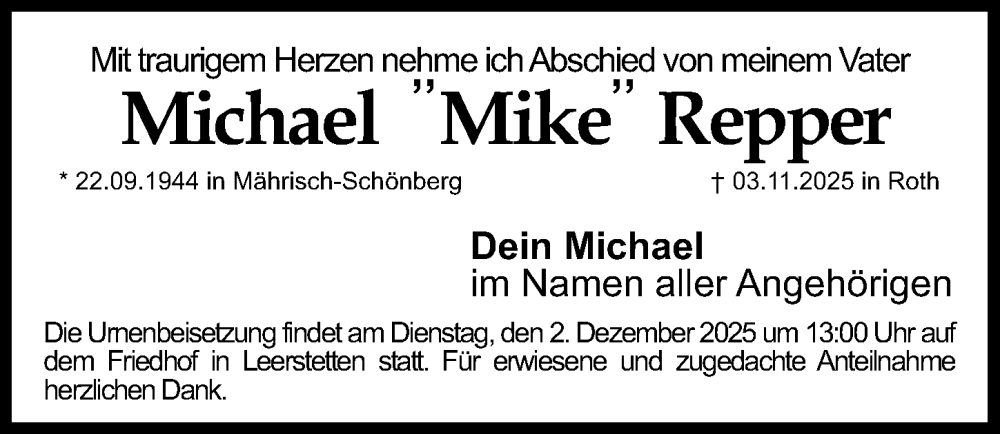 Hier finden Sie alle Traueranzeigen aus der Zeitung, die bisher für Michael Repper erschienen sind. Weitere Traueranzeigen, die in der Zeitung erscheinen, werden hier ebenfalls aufgelistet