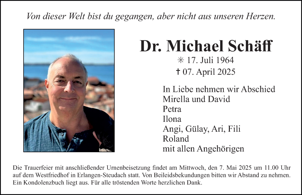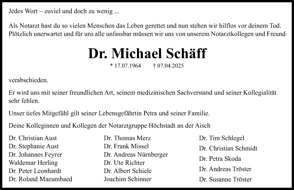 Hier finden Sie alle Traueranzeigen aus der Zeitung, die bisher für Michael Schäff erschienen sind. Weitere Traueranzeigen, die in der Zeitung erscheinen, werden hier ebenfalls aufgelistet