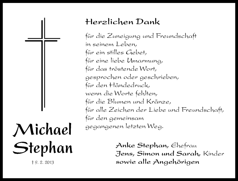Hier finden Sie alle Traueranzeigen aus der Zeitung, die bisher für Michael Stephan erschienen sind. Weitere Traueranzeigen, die in der Zeitung erscheinen, werden hier ebenfalls aufgelistet