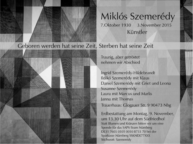 Hier finden Sie alle Traueranzeigen aus der Zeitung, die bisher für Miklós Szemerédy erschienen sind. Weitere Traueranzeigen, die in der Zeitung erscheinen, werden hier ebenfalls aufgelistet