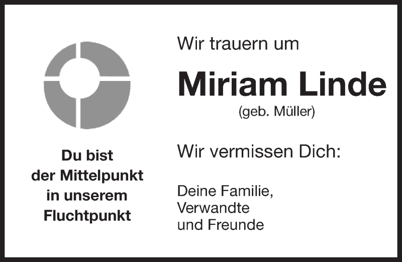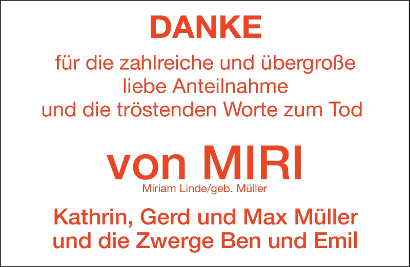 Hier finden Sie alle Traueranzeigen aus der Zeitung, die bisher für Miriam Linde erschienen sind. Weitere Traueranzeigen, die in der Zeitung erscheinen, werden hier ebenfalls aufgelistet