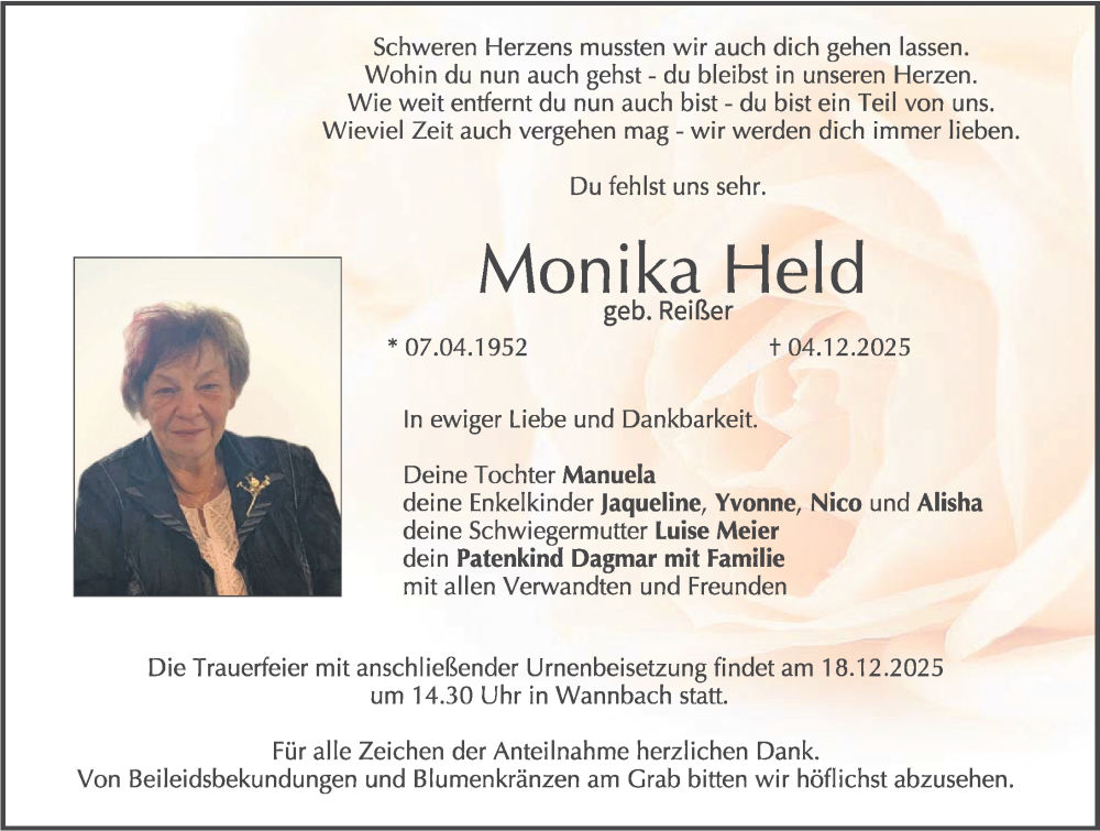 Hier finden Sie alle Traueranzeigen aus der Zeitung, die bisher für Monika Held erschienen sind. Weitere Traueranzeigen, die in der Zeitung erscheinen, werden hier ebenfalls aufgelistet