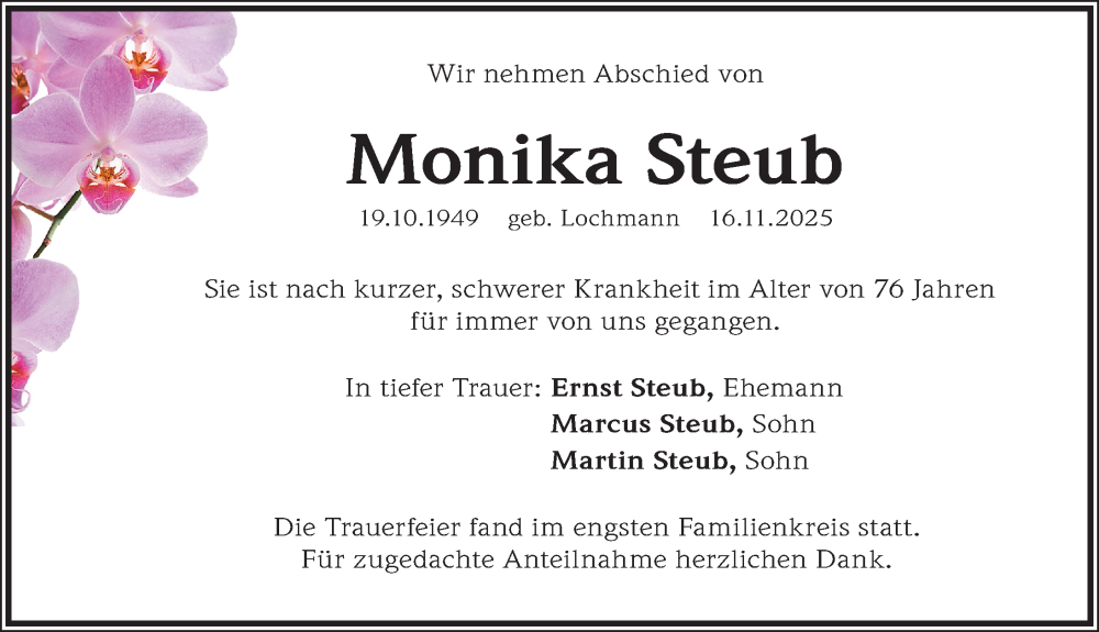 Hier finden Sie alle Traueranzeigen aus der Zeitung, die bisher für Monika Steub erschienen sind. Weitere Traueranzeigen, die in der Zeitung erscheinen, werden hier ebenfalls aufgelistet