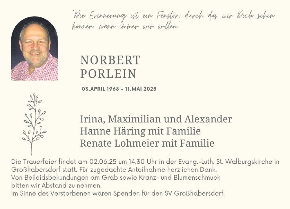 Hier finden Sie alle Traueranzeigen aus der Zeitung, die bisher für Norbert Porlein erschienen sind. Weitere Traueranzeigen, die in der Zeitung erscheinen, werden hier ebenfalls aufgelistet