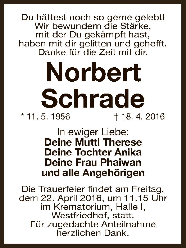 Hier finden Sie alle Traueranzeigen aus der Zeitung, die bisher für Norbert Schrade erschienen sind. Weitere Traueranzeigen, die in der Zeitung erscheinen, werden hier ebenfalls aufgelistet